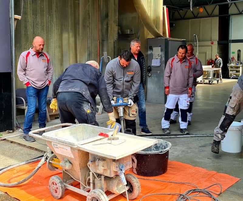 In de middag was het tijd voor de praktijk. Mortelleverancier Grouttech was met materiaal en materieel aanwezig voor een introductie betonspuiten. Dit is een voor ons nieuwe reparatietechniek. Met behulp van een pomp en compressor kunnen eenvoudiger, sneller en vooral met een lagere fysieke belasting, grotere hoeveelheden betonreparatiemortel worden verwerkt dan dat handmatig kan. Deze methode kan gebruikt worden voor reparaties aan wanden, maar ook aan plafonds.