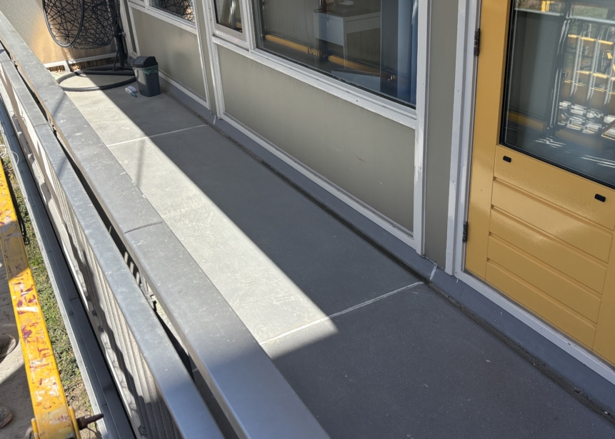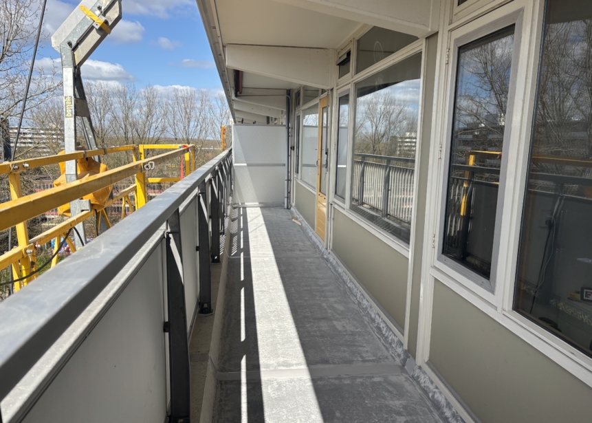 Aan de balkonzijde worden de hekken, diktekanten en vloeren grondig gereinigd. We vervangen de dilatatievoegen, schilderen de diktekanten en brengen een veilige antislipvloer aan.