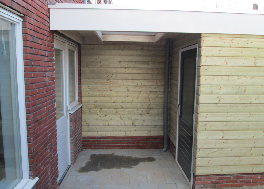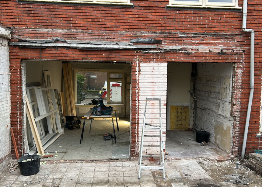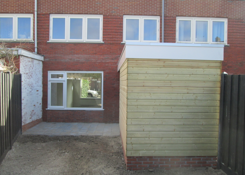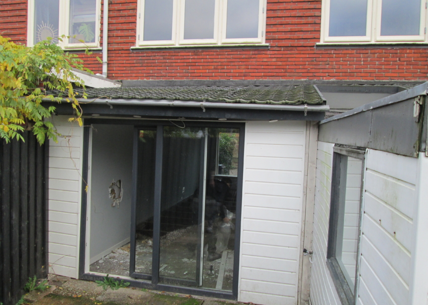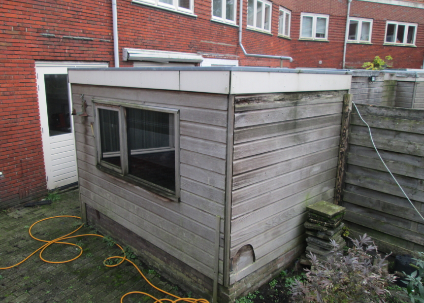 De achtergevel, die eerder door de bewoners zelf was gesloopt en uitgebouwd, is hersteld in de originele staat, met kozijnen die precies hetzelfde zijn nagemaakt in onze eigen werkplaats. Daarnaast is er een nieuwe schuur met afdak geplaatst. Dit gebeurde in overleg met de afdeling monumenten van de gemeente Haarlem.