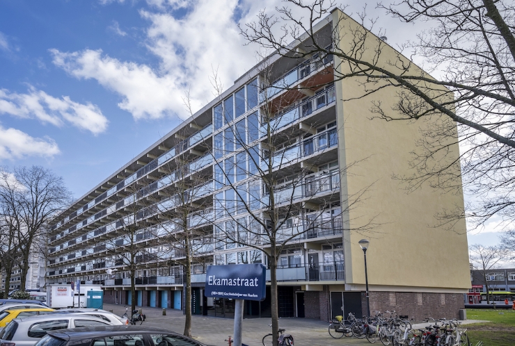 Door een storm was bij een kopgevel van een flat aan de Ekamastraat in Haarlem een groot gedeelte van de bestaande isolatielaag eraf gewaaid. Daarom vernieuwde Etro in opdracht van woningcorporatie Pré Wonen, de isolatielaag en het stucwerk van zes kopgevels in deze straat.